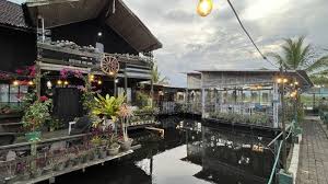 Kafe ini menawarkan pengalaman yang cukup berbeda: pengunjung melewati sebuah jembatan kayu menuju area utama yang berada di tengah telaga dengan bunga teratai sebagai dekorasi alami.